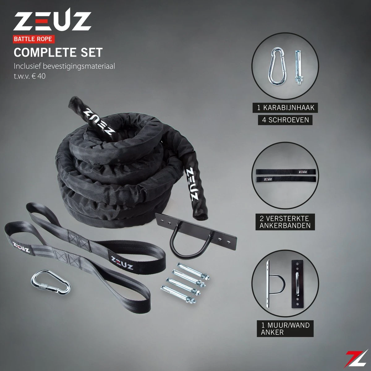 De ZEUZ® battle rope wordt geleverd met alle benodigde materialen zodat je direct kan beginnen met trainen! In de set zijn de volgende items inbegrepen: