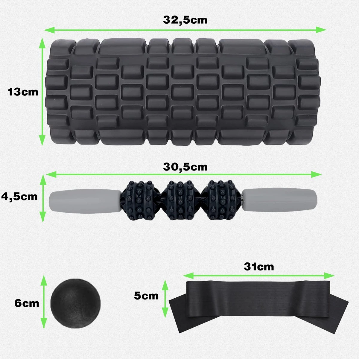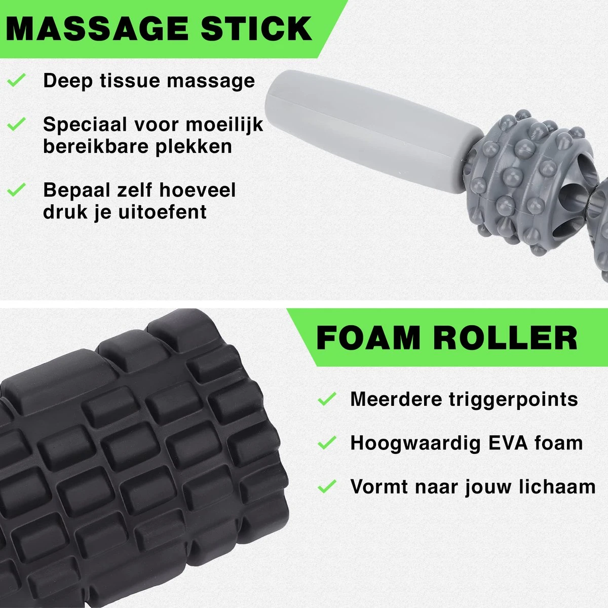 Deze complete set bevat een foam roller, een massage stick, een massage bal, een weerstandsband en een opbergtas.