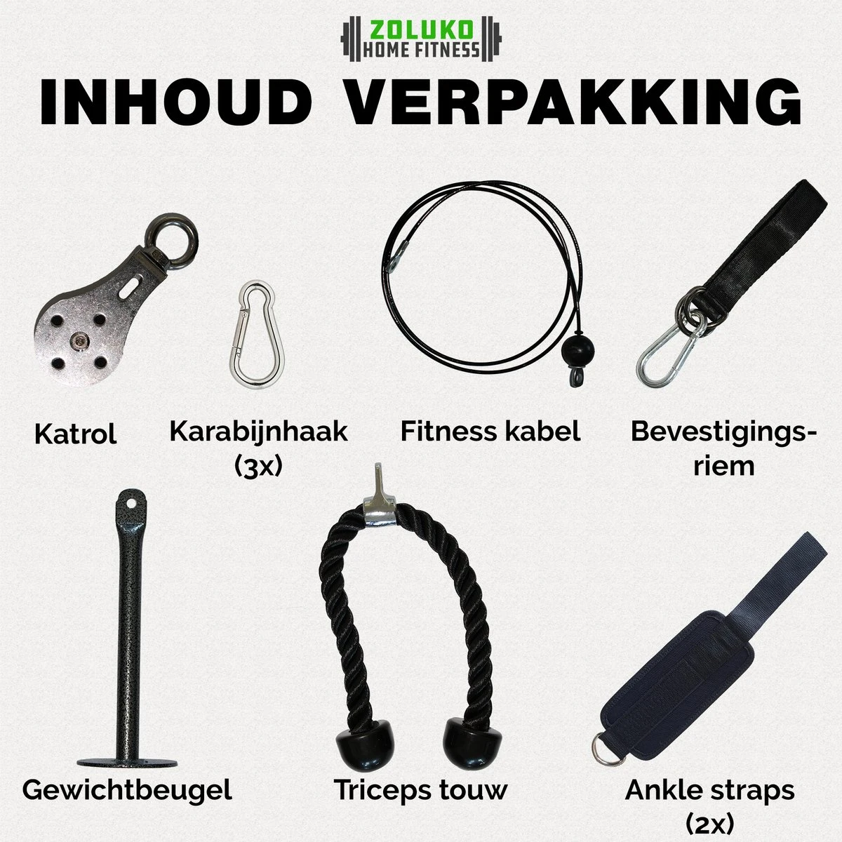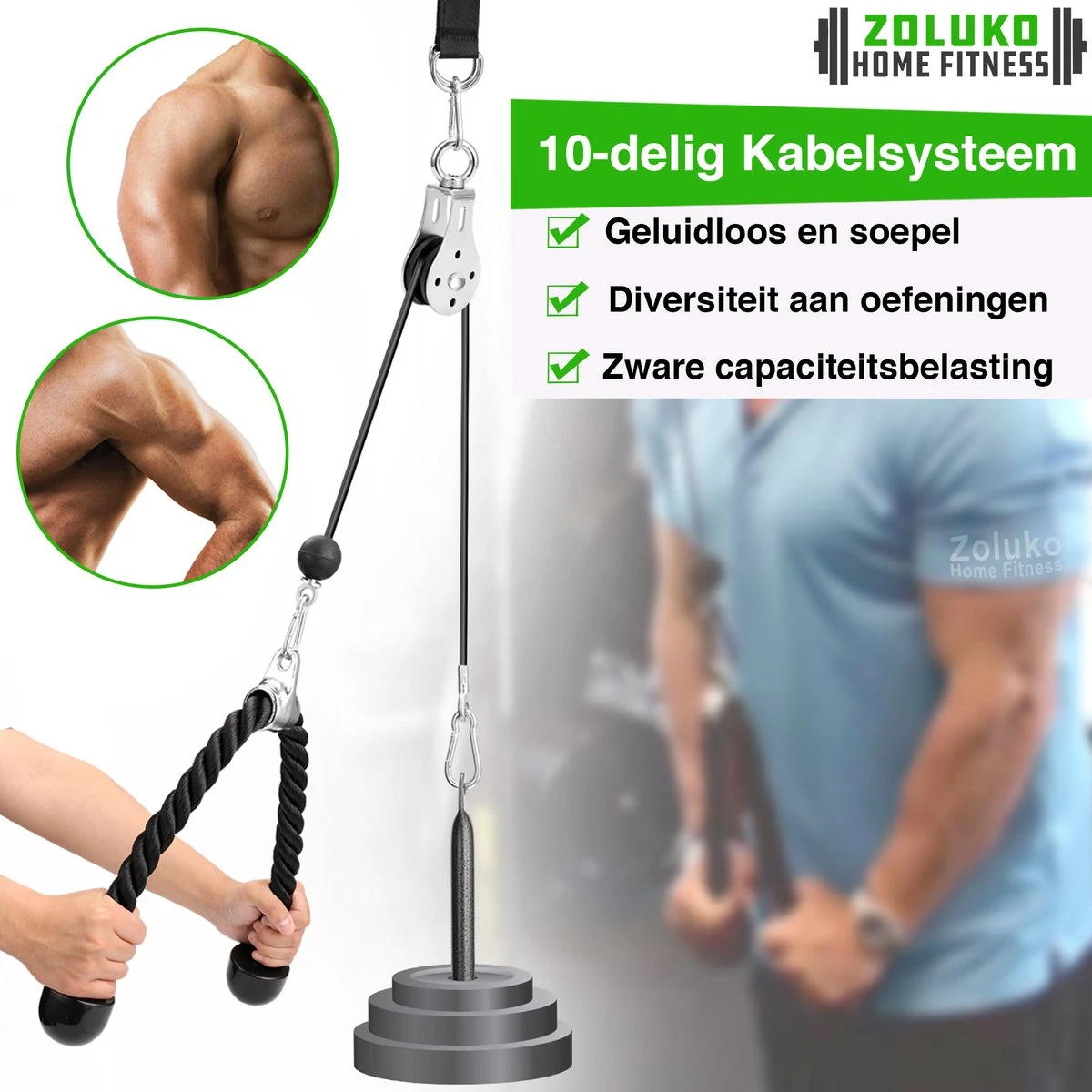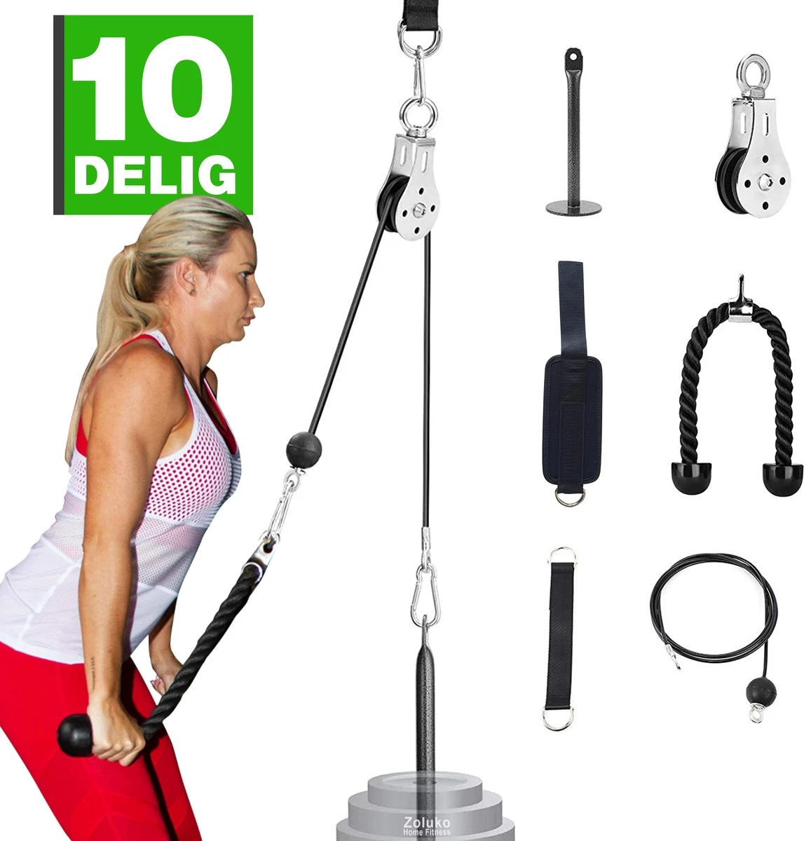 Het Zoluko professionele fitness kabelsysteem geeft je de mogelijkheid om een diversiteit aan oefeningen uit te voeren vanuit het comfort van je eigen huis. Daarnaast zorgen de verschillende onderdelen voor een unieke manier van spierbelasting.