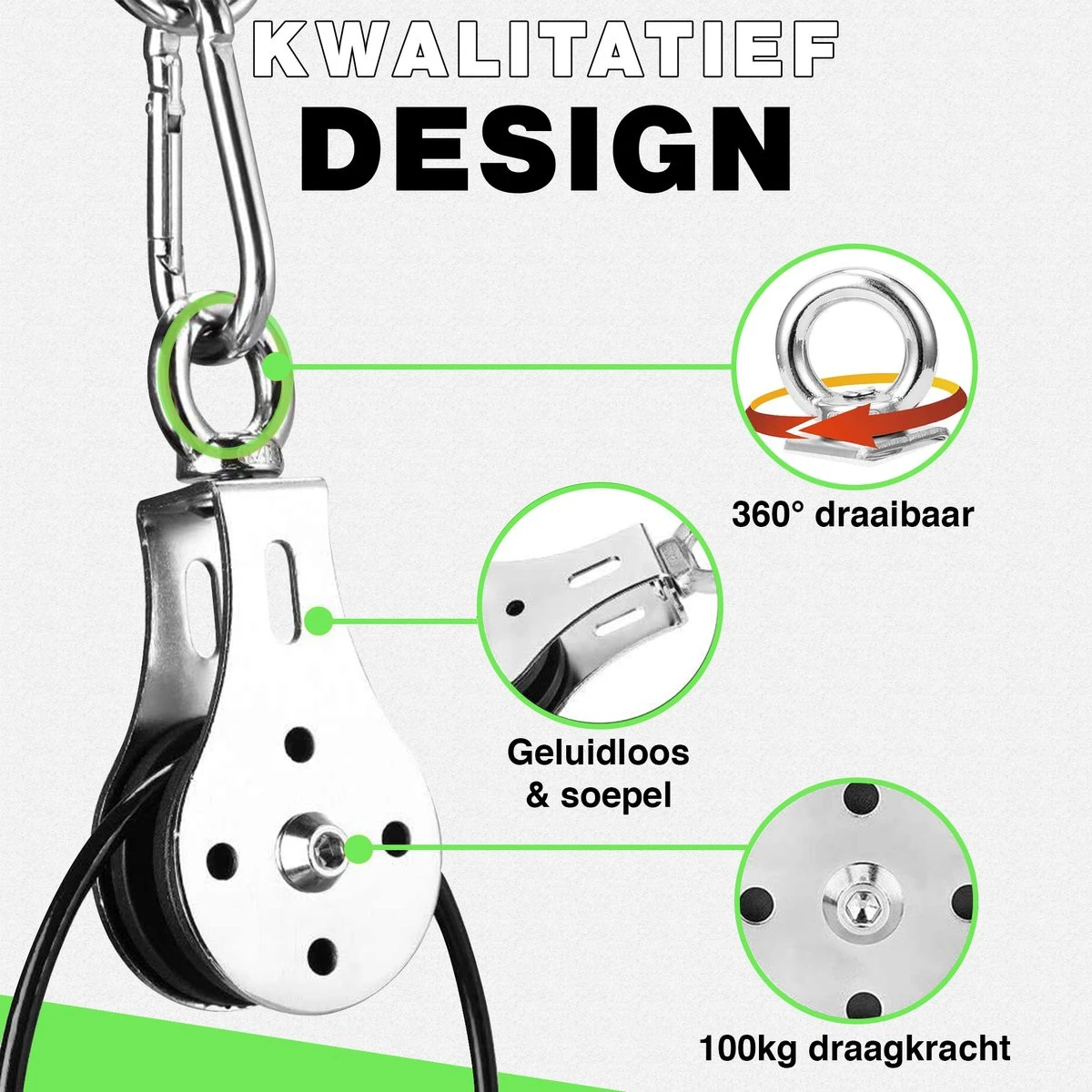 Speciaal voor thuis sporters is de complete set van professionele kwaliteit gemaakt. Zo is het gelagerde 360° verdraaibare katrolsysteem geluidloos en uitgerust met roestvrijstalen karabijnhaken. Daarnaast heeft de verbeterde stalen laadpin een maximale gewichtsbelasting van maar liefst 100 kilogram!