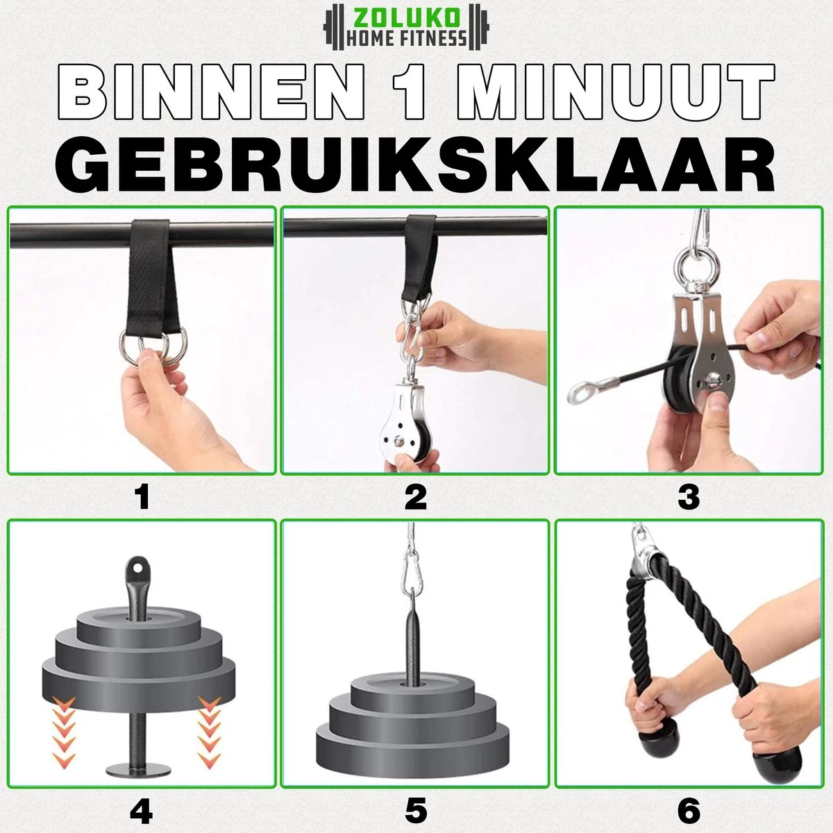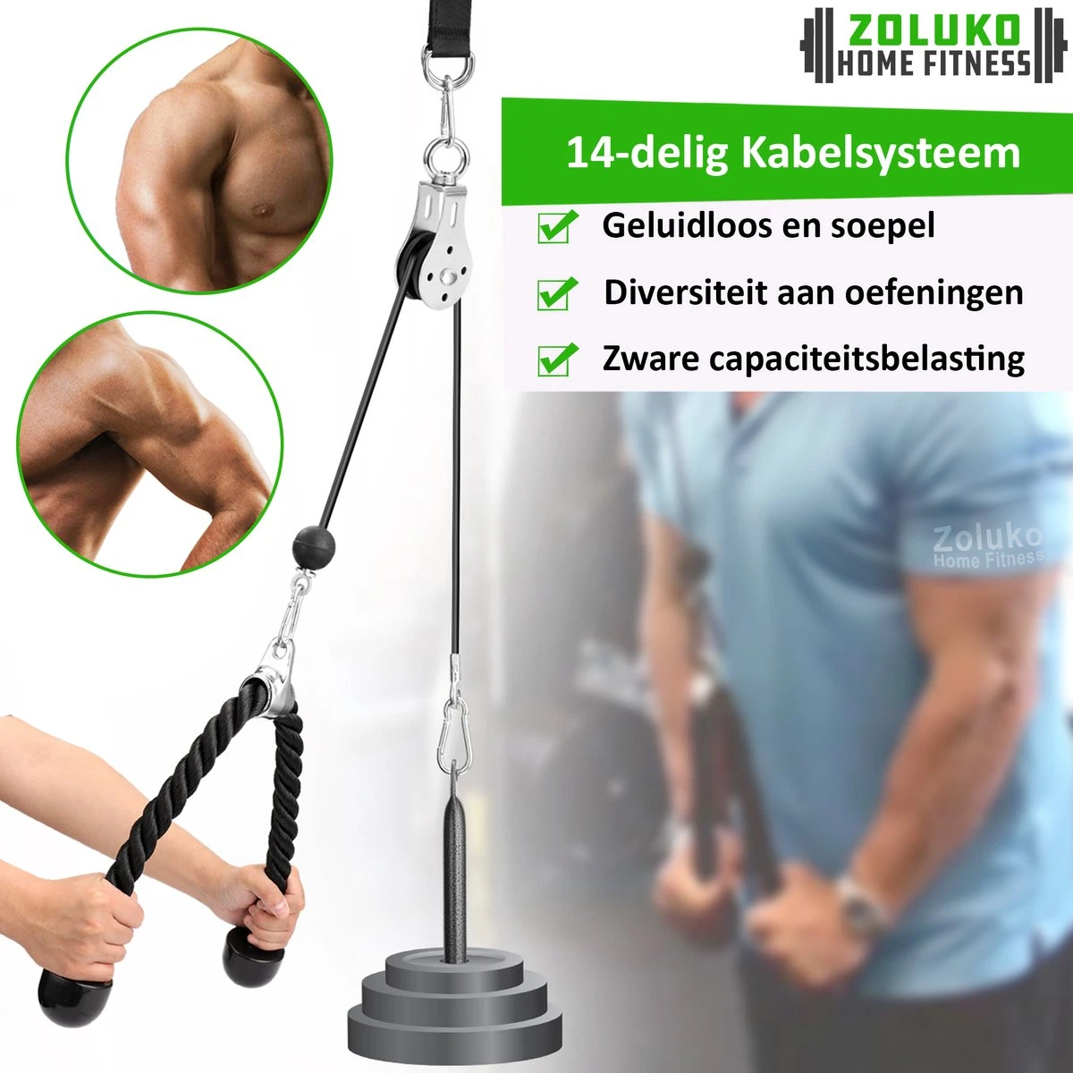 Het Zoluko professionele fitness kabelsysteem geeft je de mogelijkheid om een diversiteit aan oefeningen uit te voeren vanuit het comfort van je eigen huis. Daarnaast zorgen de verschillende handgrepen voor een unieke manier van spierbelasting.