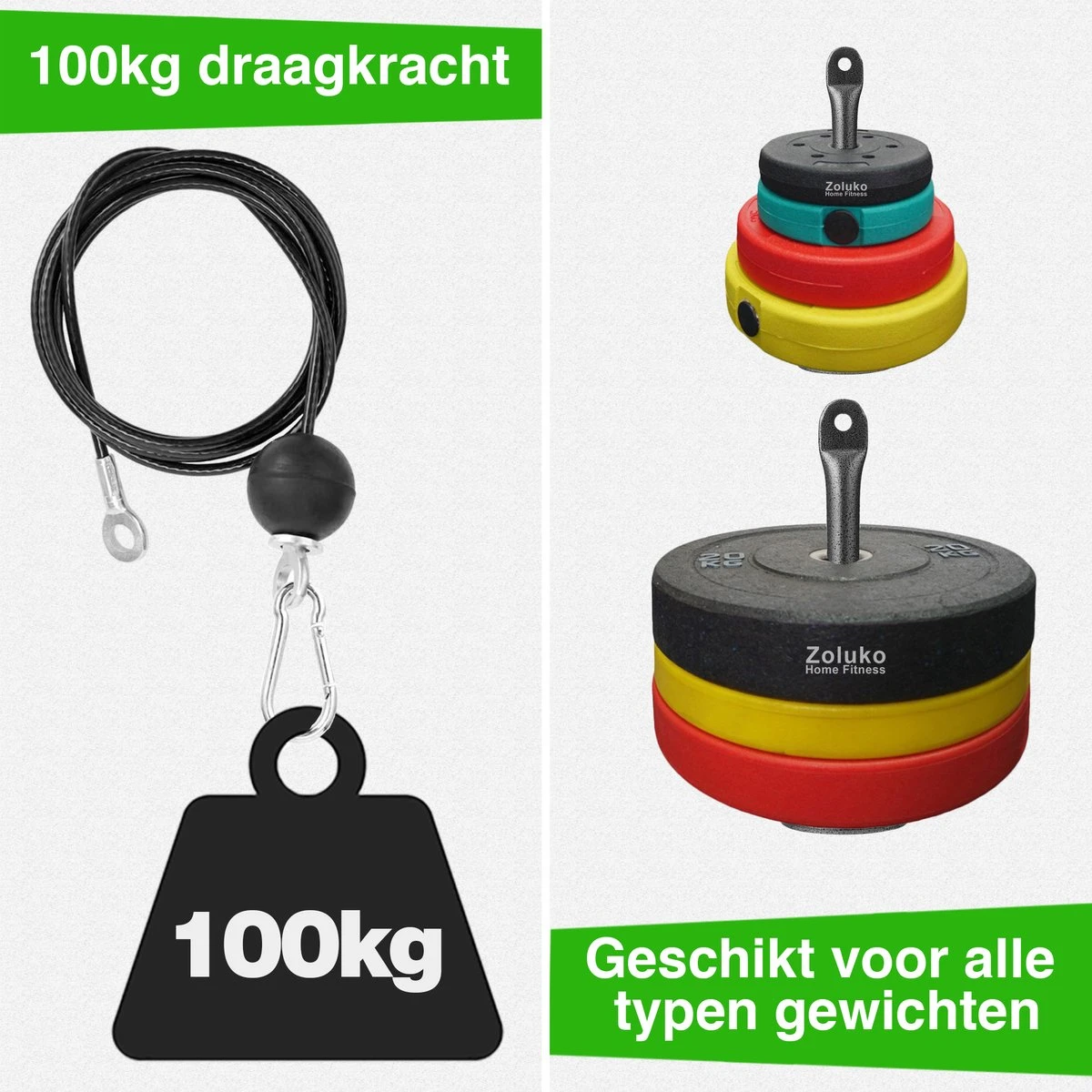 Speciaal voor thuis sporters is de complete set van professionele kwaliteit gemaakt. Zo is het gelagerde 360° verdraaibare katrolsysteem geluidloos en uitgerust met roestvrijstalen karabijnhaken. Daarnaast heeft de verbeterde stalen laadpin een maximale gewichtsbelasting van maar liefst 100 kilogram!